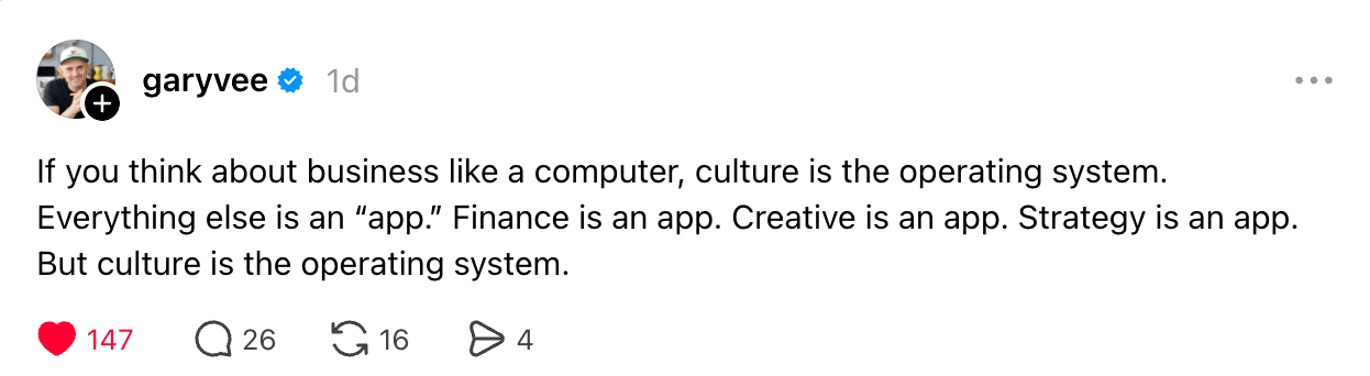 There’s nothing like an aperol spritz on your layover in Rome teasing Euro Summer to realize that we are already in Q2 for 2026. Shockingly, that means we only have 8 months left to achieve our goals before everyone starts recapping their year. I spent some time reflecting on Q1 of 2026 while we were in Africa and it’s wild how much you can do in 90 days especially with Ai. I am fully on the Claude train and completely stopped using ChatGPT, despite them really bolstering their entertainment roster with their latest landmark acquisition of TBPN right after coming off the heels of poaching Instagram’s Celebrity Whisperer, Charles Porch in newly created role as OpenAI’s VP of global creative partnerships, it’s clear OpenAI is going after culture. I actually loved this thread from Gary Vee about culture and the importance of it moving forward in an ever-changing world.